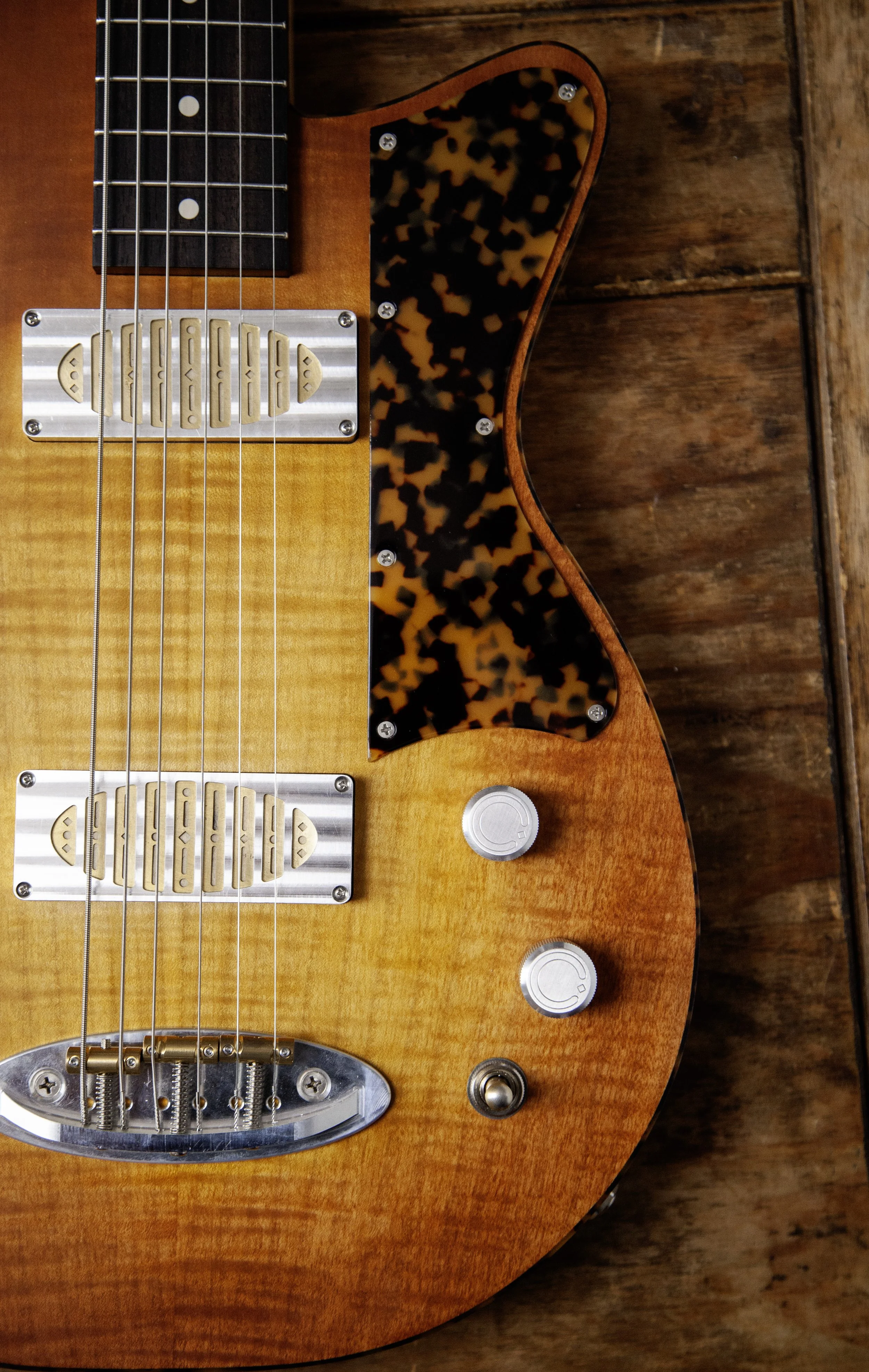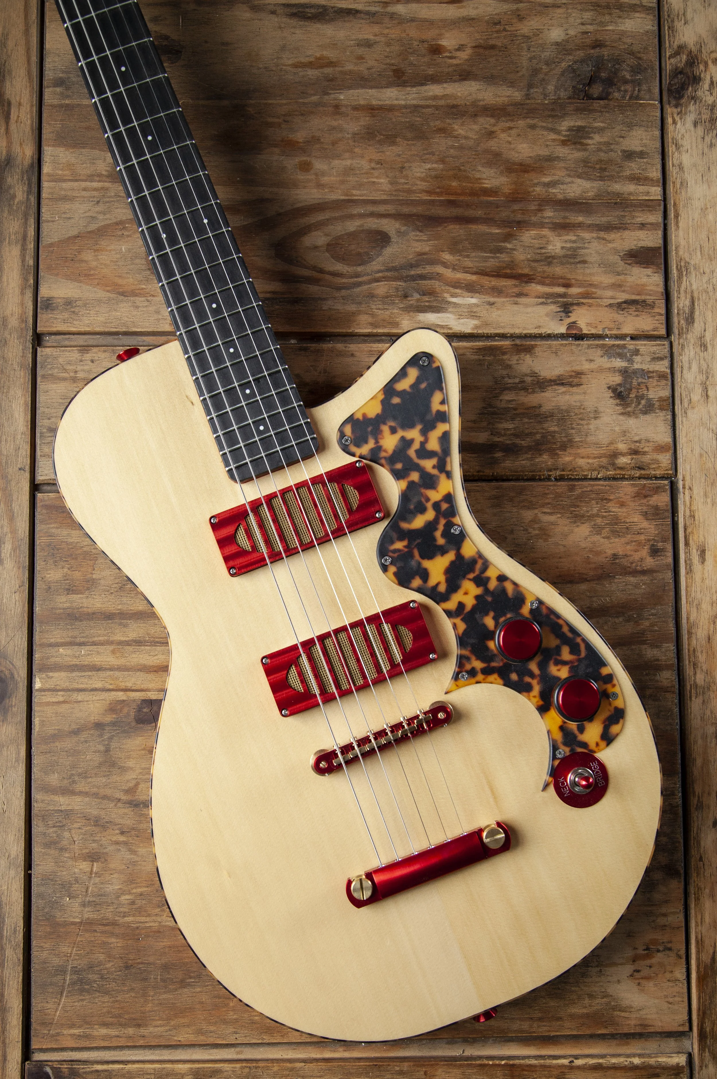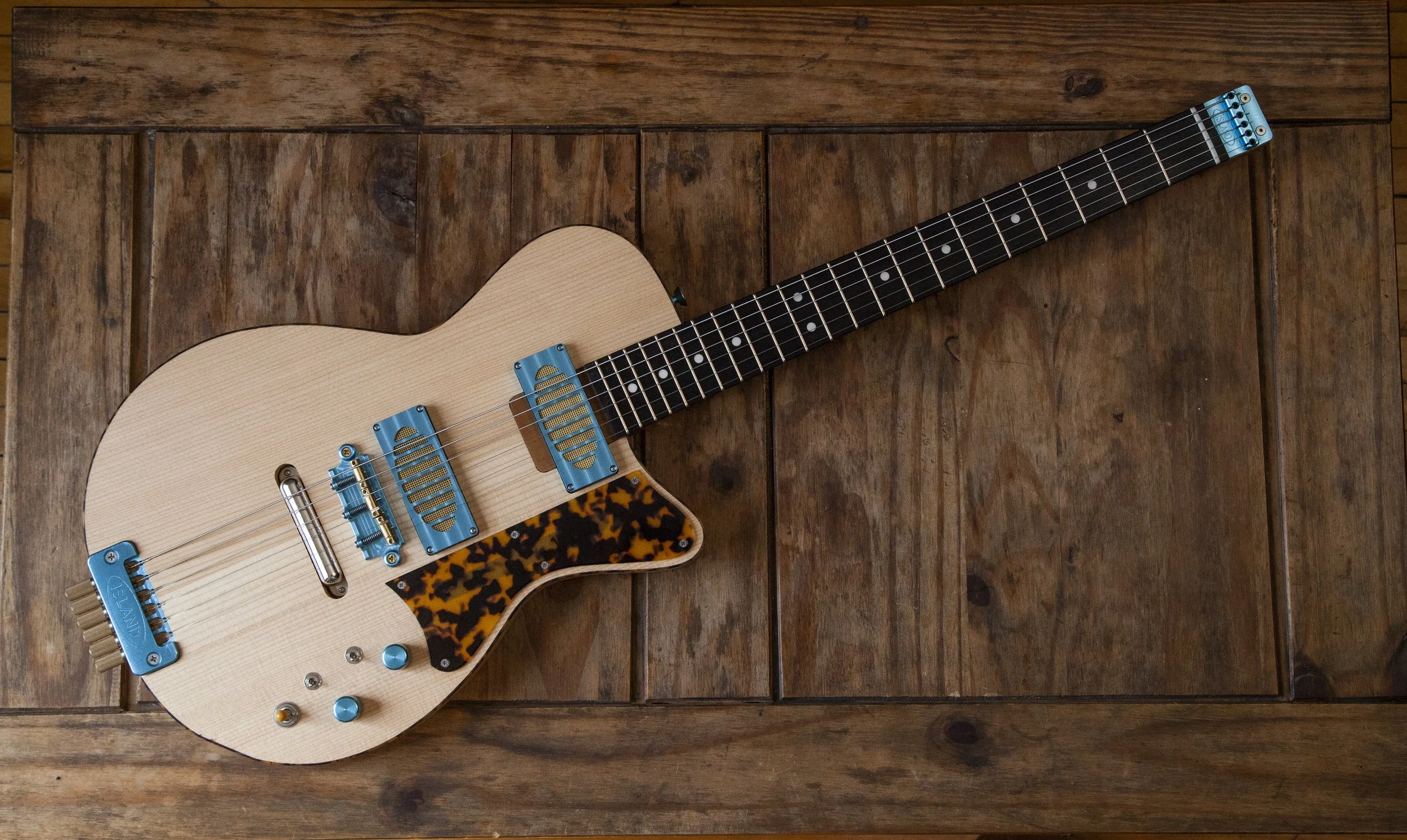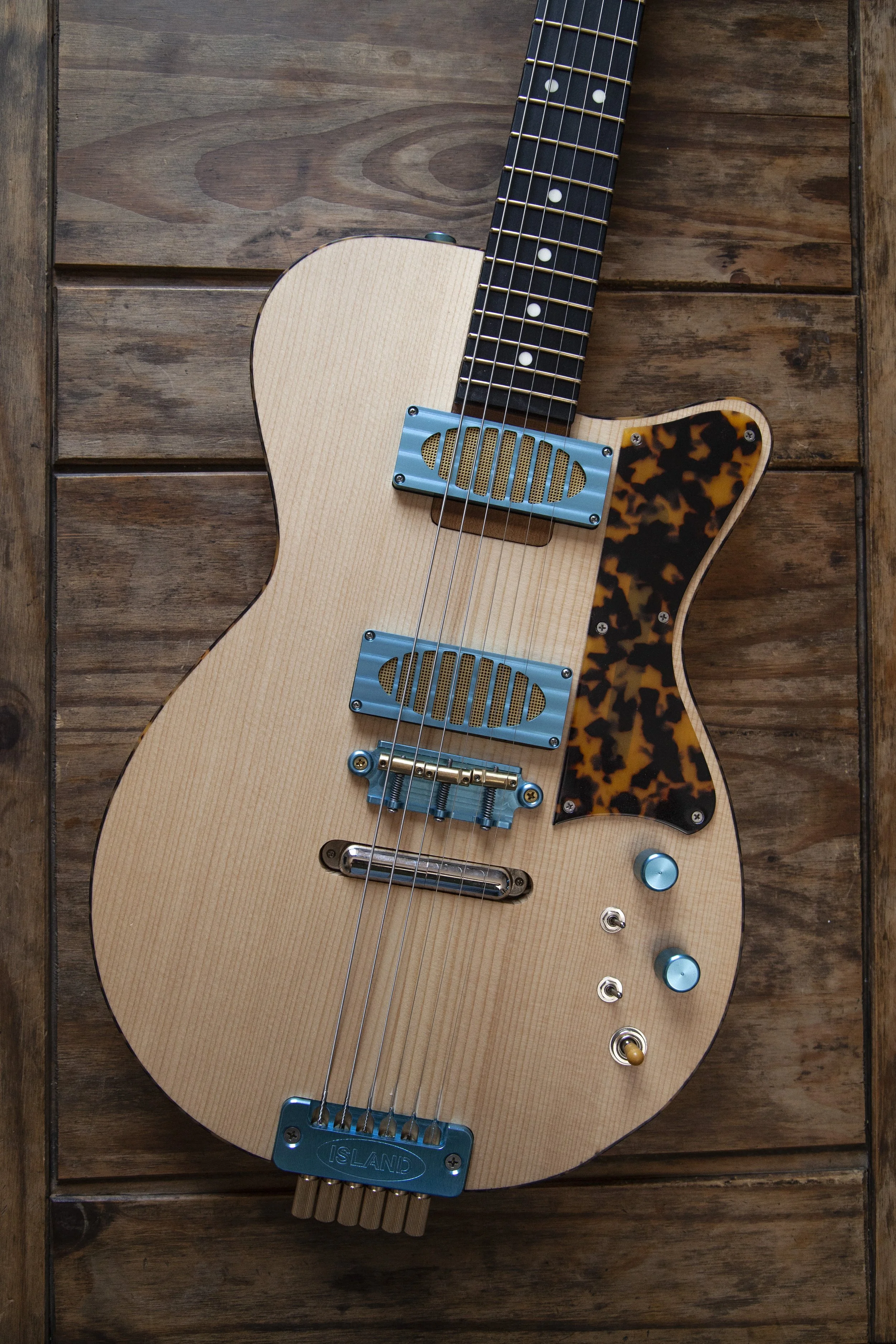 The Atoll shape is inspired by Danelectro. It was originally designed as a baritone guitar, and then became a slightly larger companion to my Forty-Four.