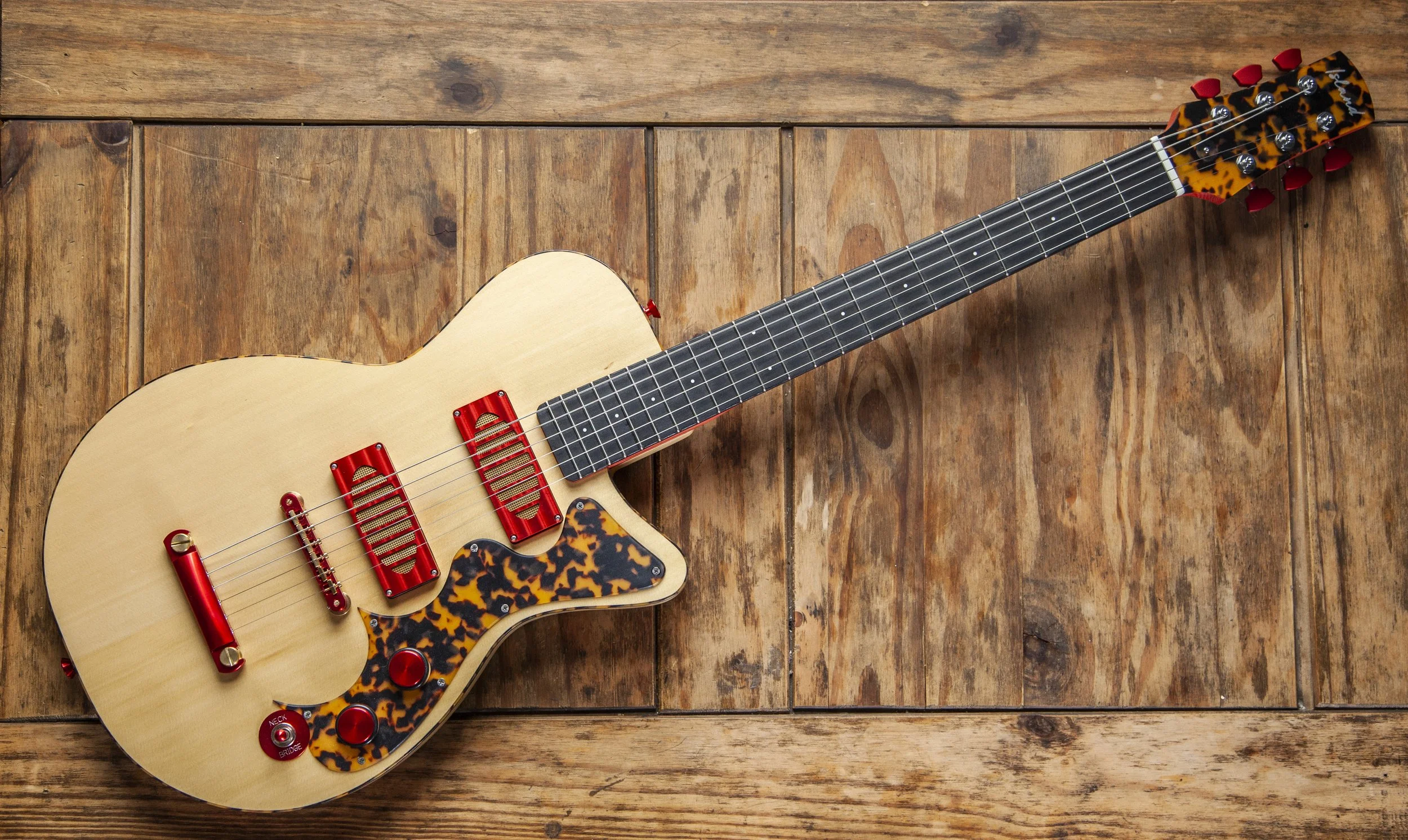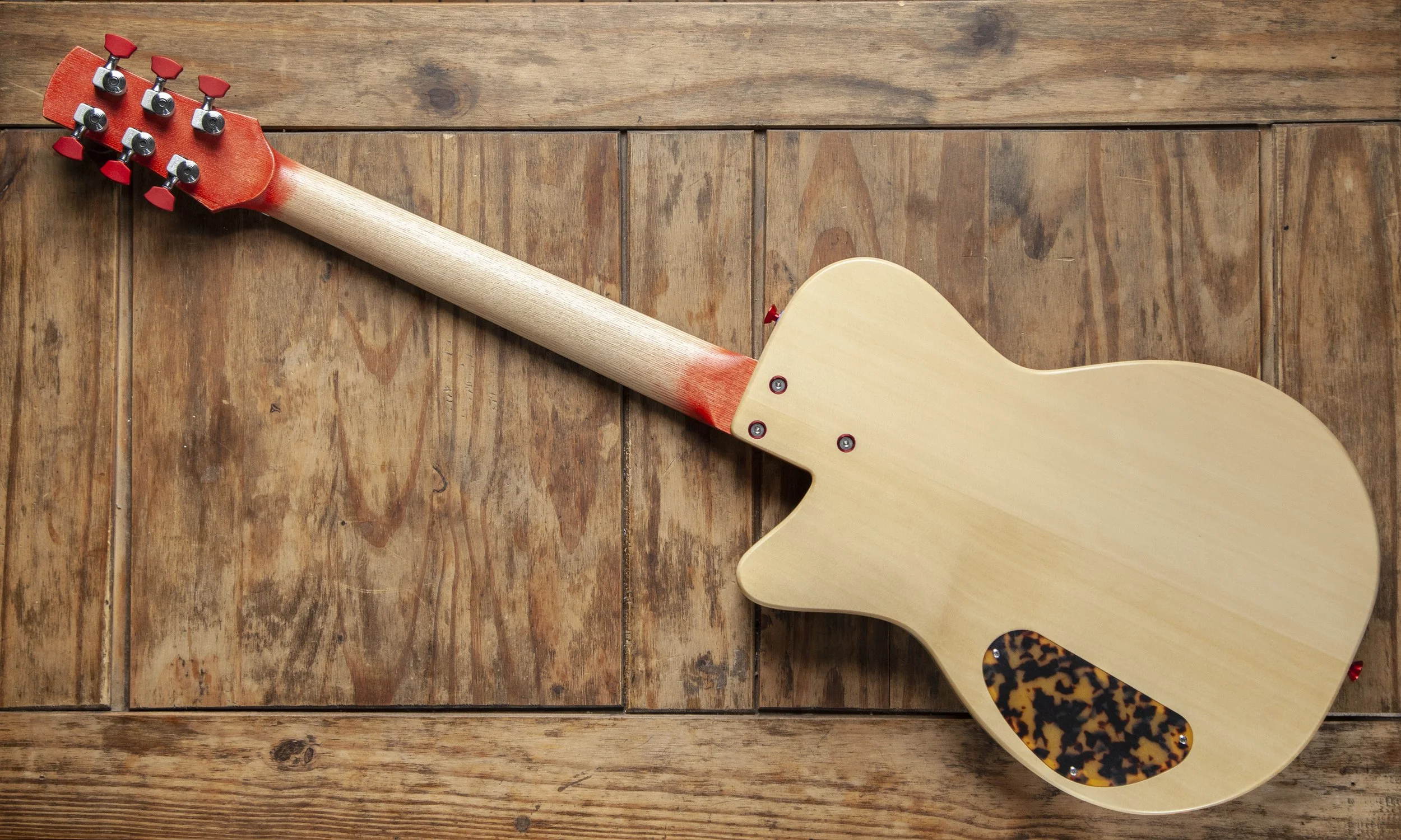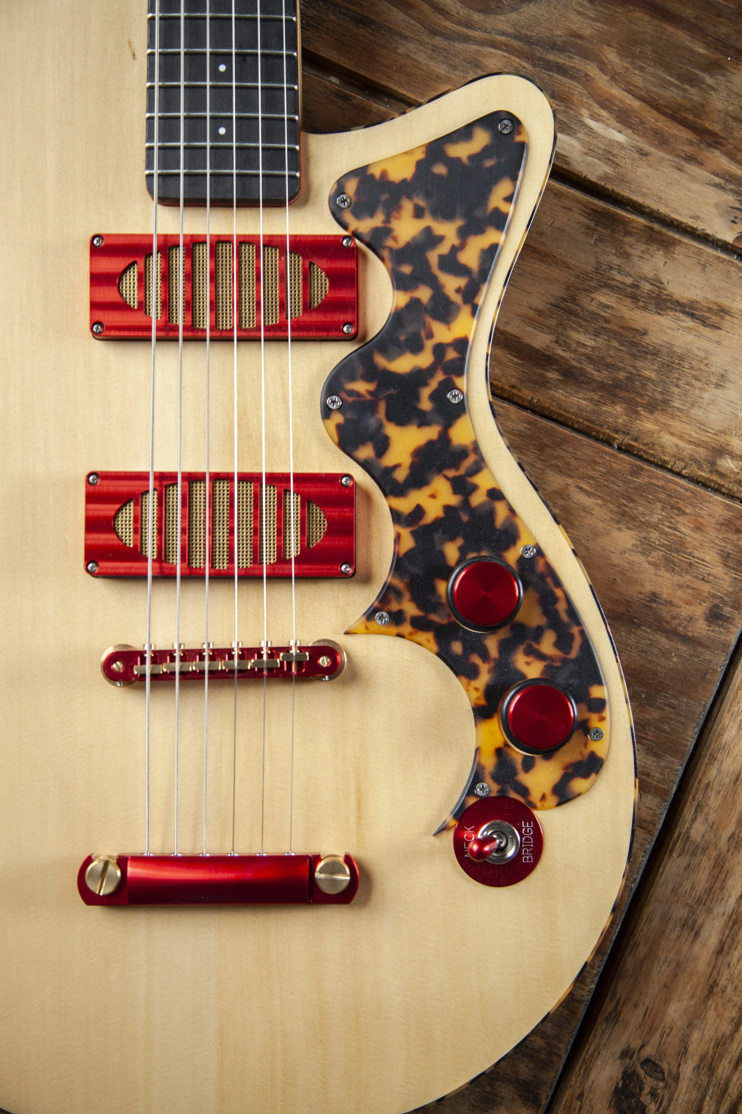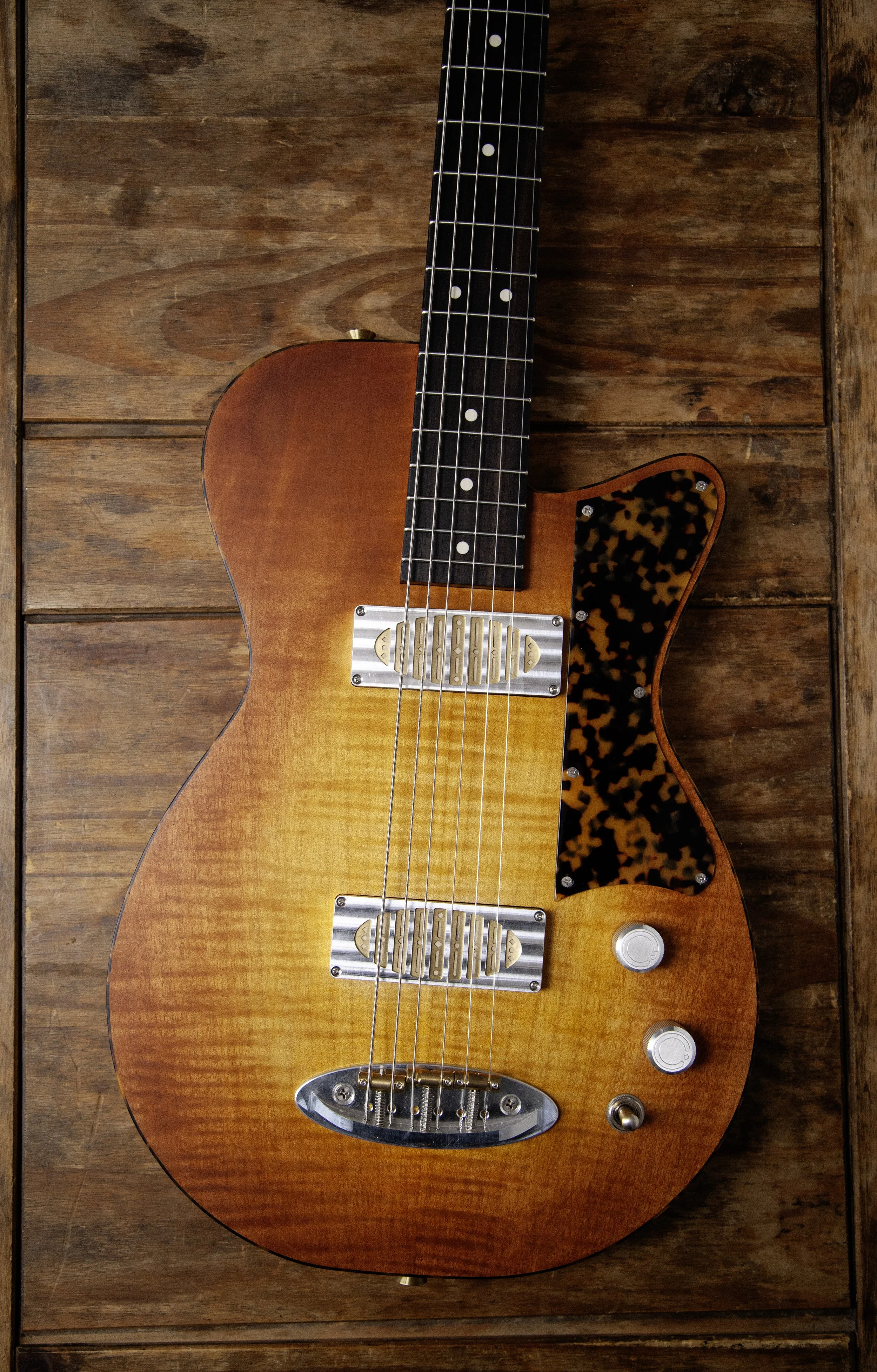 The Atoll shape is inspired by Danelectro. It was originally designed as a baritone guitar, and then became a slightly larger companion to my Forty-Four.